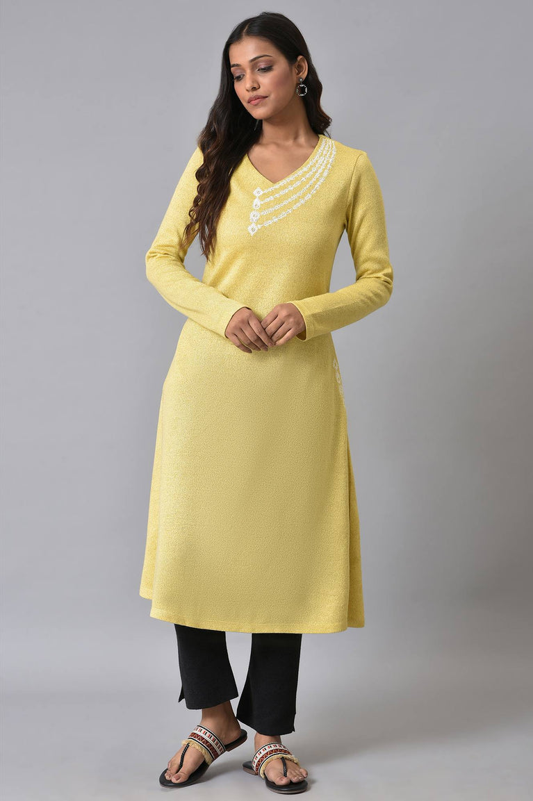 Get Yourself An Effortless Gleaming Look In Our Sensational Cable Knit kurta Accentuated With Lurex Knitting. This Easy Going Graceful Style Can Be Paired With A Variety Of Contrast Bottoms And Shawls Available In The Range.