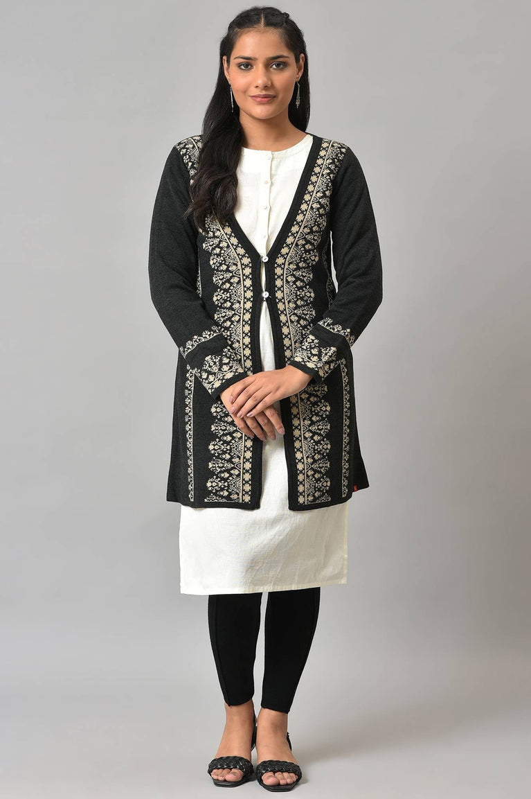 Mid Length Anthracite And Sea Salt Front Open Reversible Jacquard Cardigan With Delicate Tonal Border Pattern.