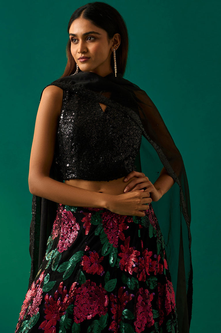 Black Sequin Embellished Straight Blouse with Skirt and Dupatta Set