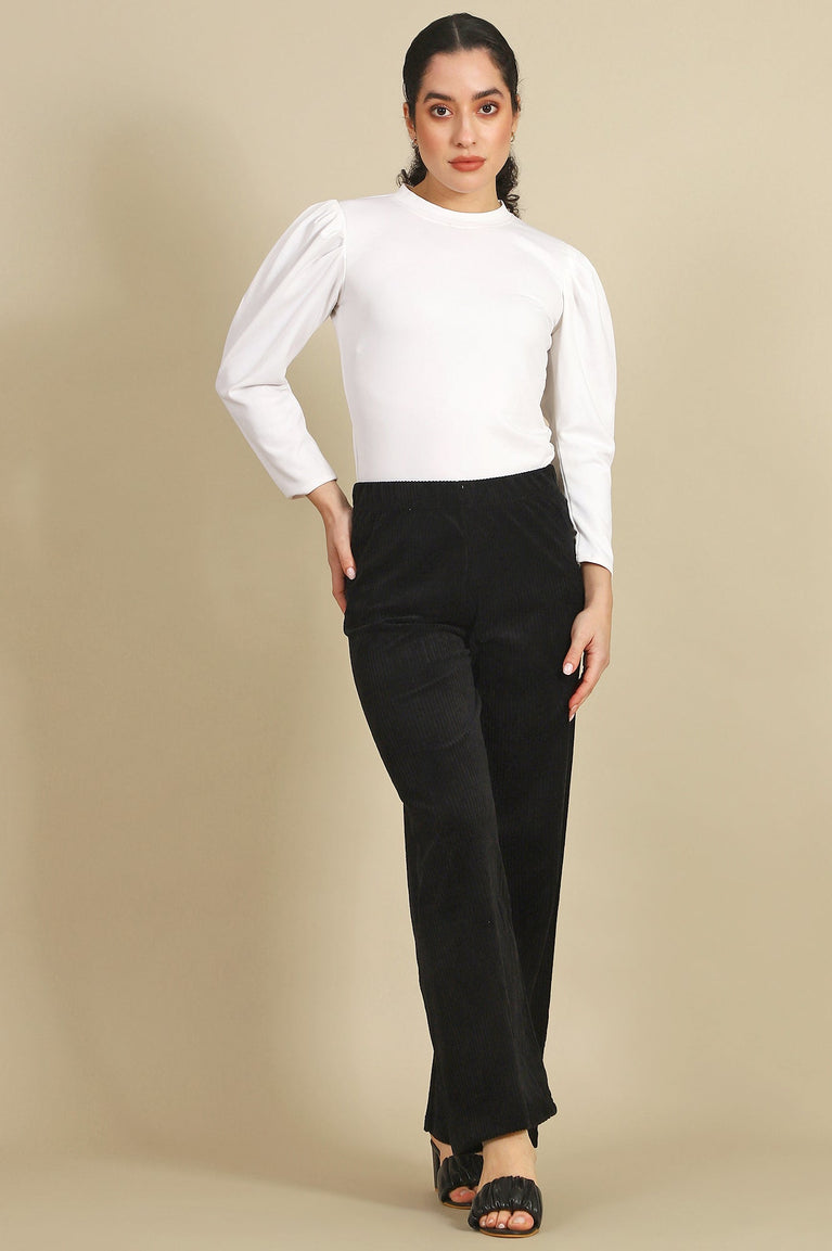Black Solid Straight Fit Cotton Pants With Elasticated Back