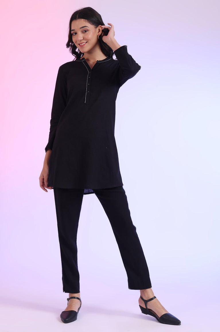 Some pieces speak in whispers, not shouts, and this is one of them. Crafted for the woman who finds power in simplicity, this stunning black kurta set for women is an ode to understated elegance. This perfectly coordinated ethnic co-ord set is fashioned from a breathable cotton slub fabric, offering a subtle texture and unparalleled comfort for all-day wear. Its straight silhouette glides effortlessly, creating a look that is both timeless and poised. This solid black cotton kurta set is a testament to minimalist ethnic wear.