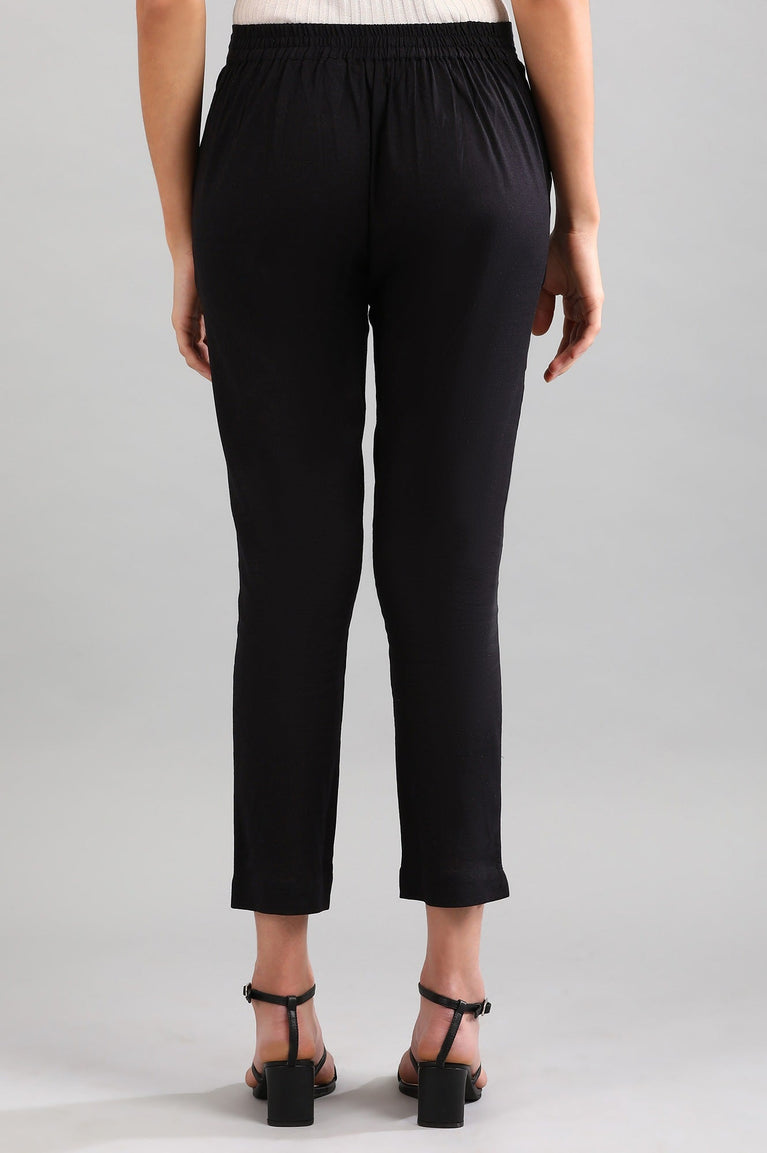 Black solid trousers with elasticated back. Wear these with contrast color kurta and ring-toed flats.