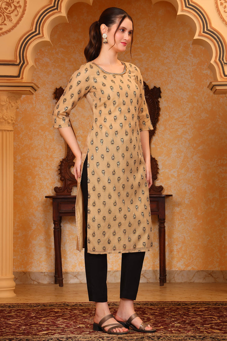 Are you looking for an elegant and stylish piece? This classy beige kurta is a great pick for you. Crafted in cotton, this floral printed women kurta had panelled body detail and godet flare.