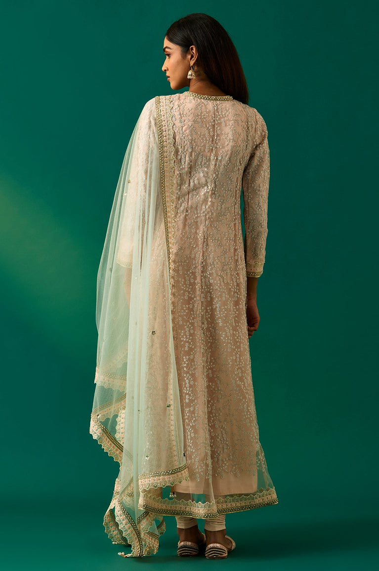 A timeless masterpiece! This beige floral embroidered Anarkali kurta set for women exudes elegance and sophistication. The kurta features intricate floral embroidery with pearl detailing along the neckline and borders, paired with a heavily flared silhouette that glides gracefully. The churidar offers a snug fit, while the lightweight embroidered dupatta with scalloped edges completes the ensemble. Perfect for weddings and festive occasions, this set is crafted to make you shine effortlessly.