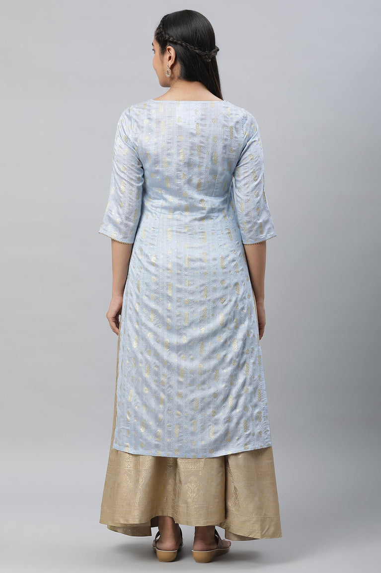 This straight light blue foil printed kurta is the perfect blend of tradition and style. The lurex jacquard fabric with foil printing adds a rich and classy appeal to this piece. The round neck with a half functional placket is accentuated with a lace insert while golden buttons tucked with tonal thread that creates a beautiful contrast against the base color. The 3/4 sleeves are also enhanced by lace inserts, uplifting the piece's overall look.