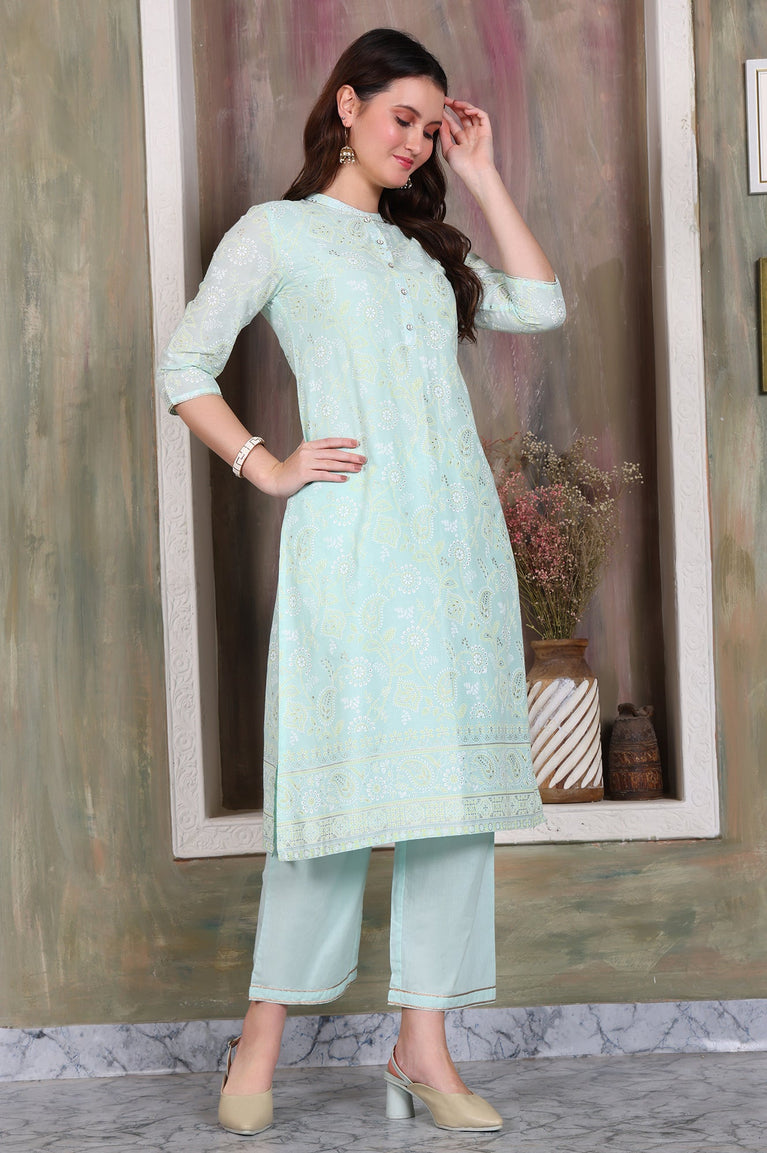 Escape the regular day with this aqua colour kurta set. This style has a close neck mandarin collar with the perfect amount of embellishment at the neck. The beautiful florals in the makes print elevates the silhouette and gives elegance, festive and grace - all in one vibe.