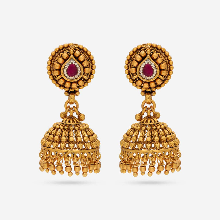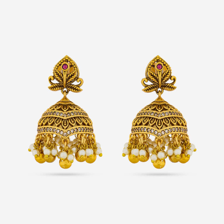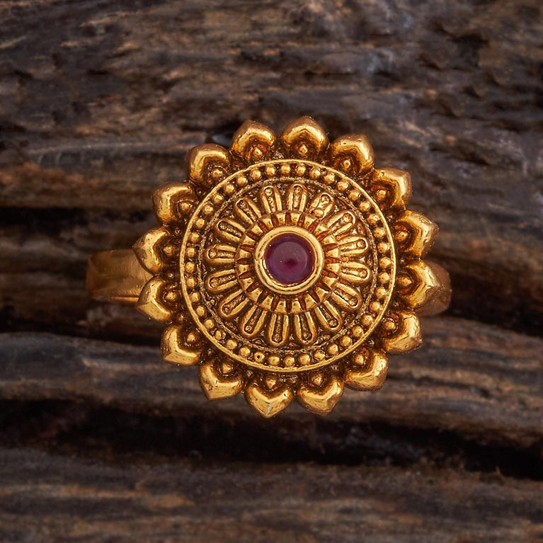 Intricate, festive, and contemporary, this fine ring is all. Adding a refreshing feel of full bloom, the white pearls, embossed gold plated floral design, floral rim, and hint of ruby stone, makes your look more exquisite and unique.