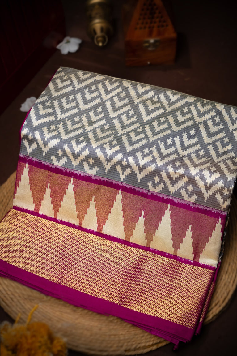 Mandir Grey and Cream & Dark Pink Ikat Ikat Saree
