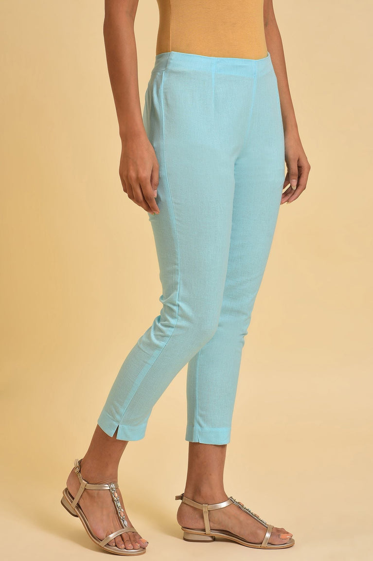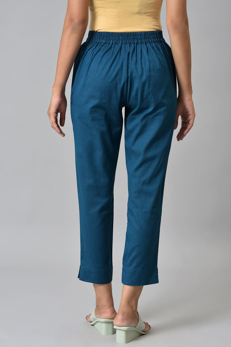 This kurta set has a blue kurta with lace yoke detail and matching trousers.