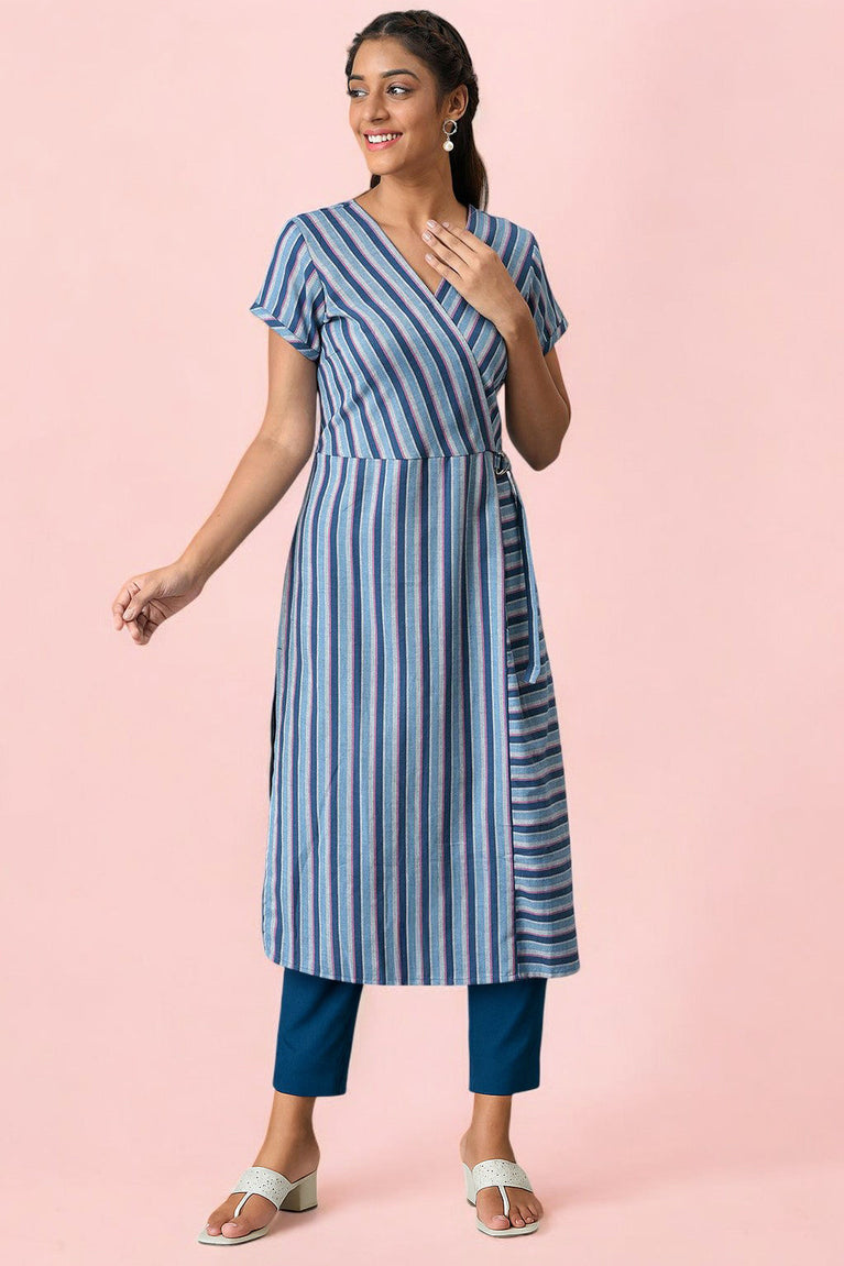 Blue and White Striped Cotton Kurex Kurta and Tight Set