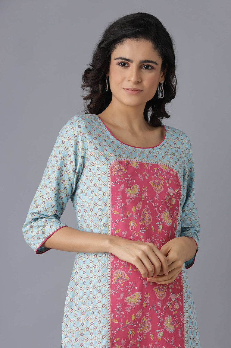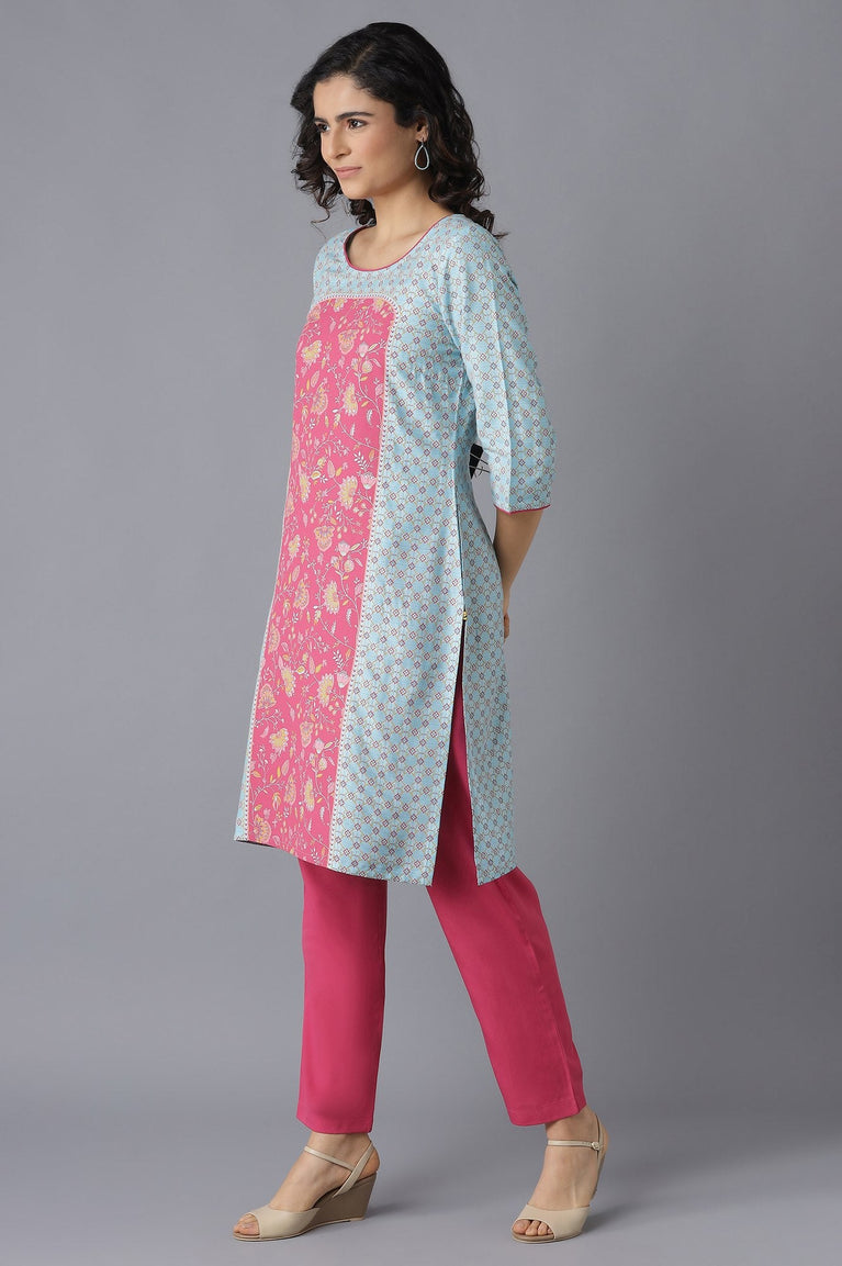 Elevate your casual day or office look by wearing this blue floral print kurta in straight silhouette. It is paired with pink tousers that add a class in your look.