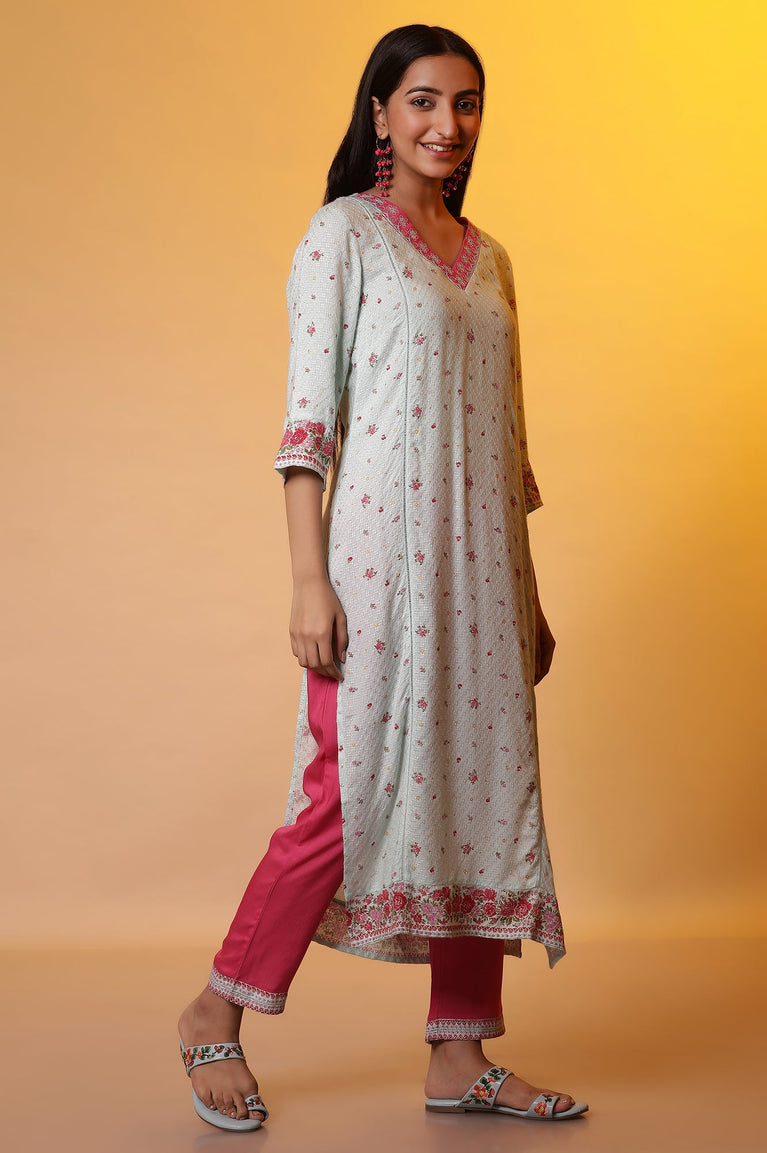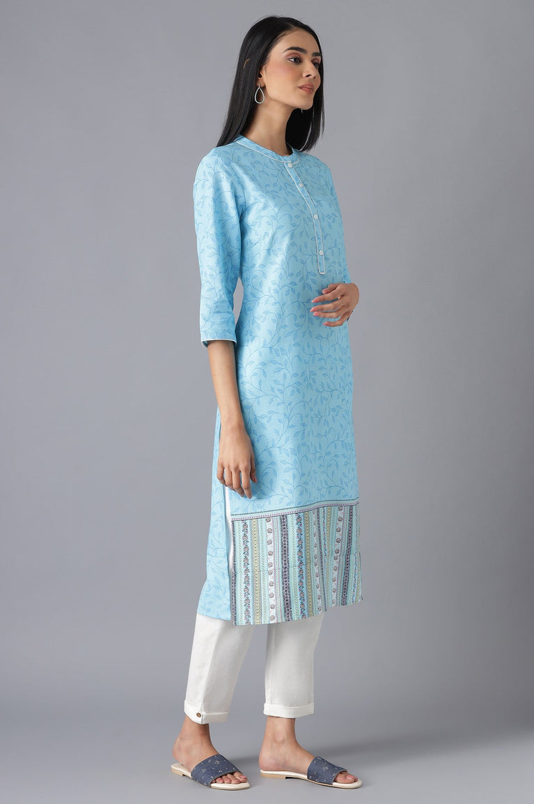 Step out in style for a casual day out or a elevate your office wardrobe with this modern ethnic kurta set. The set includes blue printed straight fit kurta and it is paired with solid trousers.
