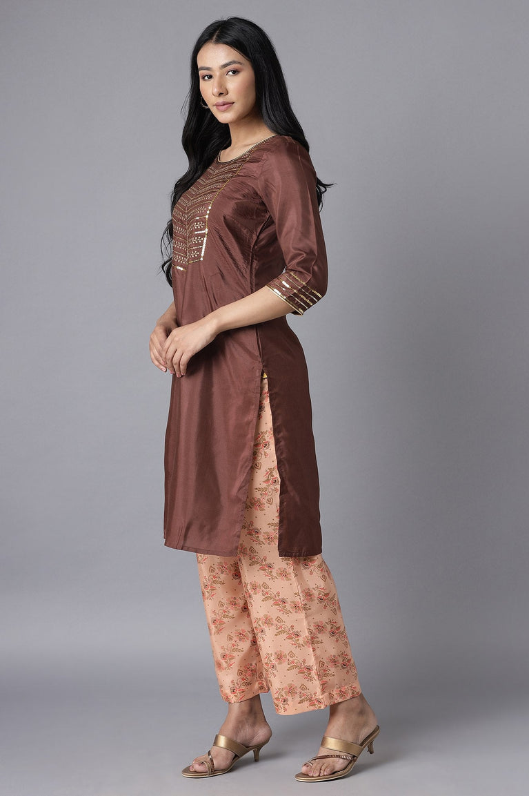 Brown Embroidered kurta In Round Neck With Yellow Straight Palazzo