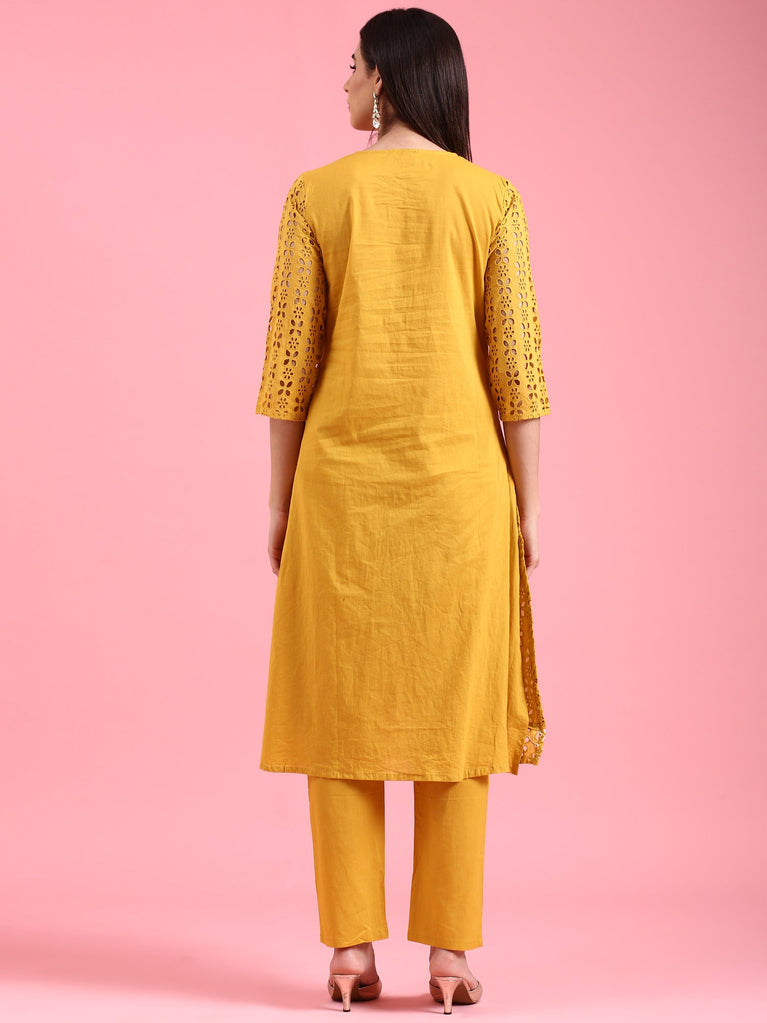 This Exquisite Set Is Crafted From Pure Cotton And Patterned With Luxurious Ethnic Motifs. It Features A Deep V-Neck, ¾ Length Sleeves, A Gorgeous Knee-Length Straight Cut, And A Finely Detailed Hemline. The Trousers And Dupatta Provide A Perfect Finishing Touch For A Timelessly Glamorous Ensemble.