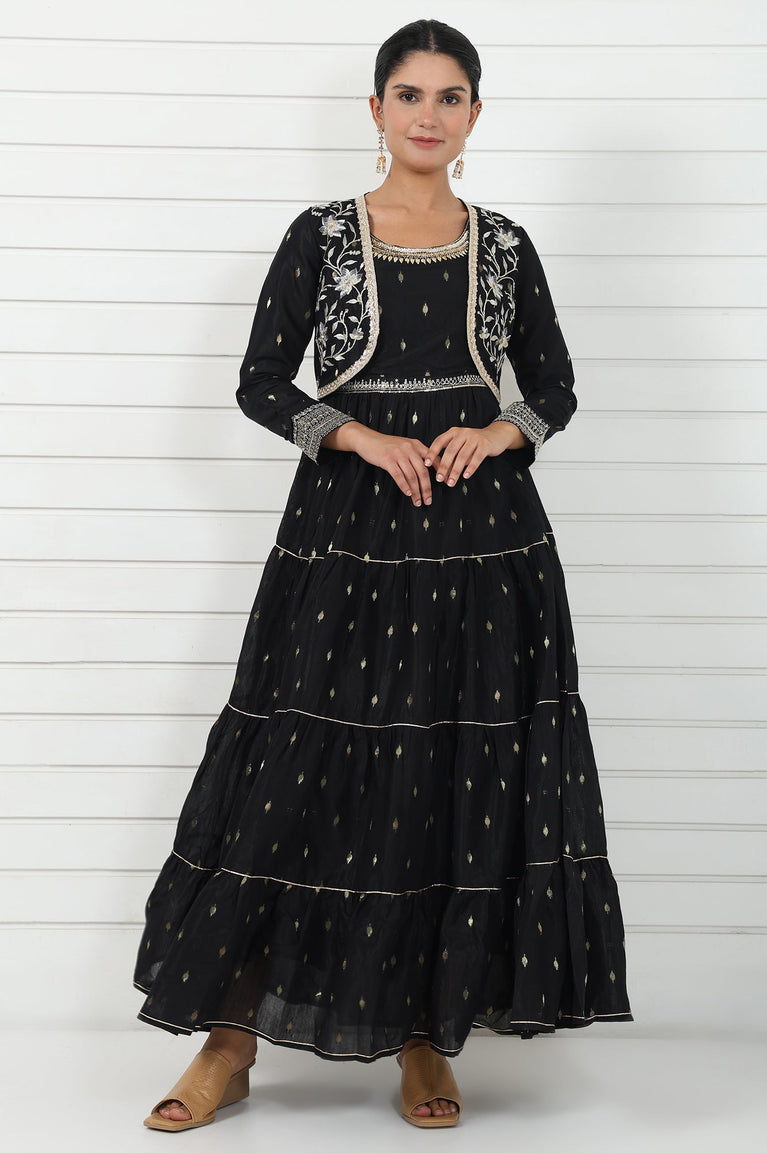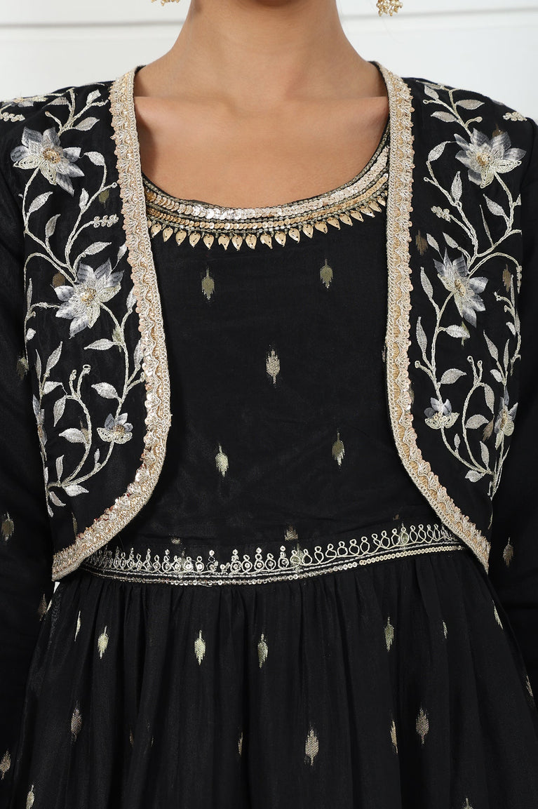 Black Abstract Printed Dori Embroidered Jacquard Flared Dress And Jacket Set