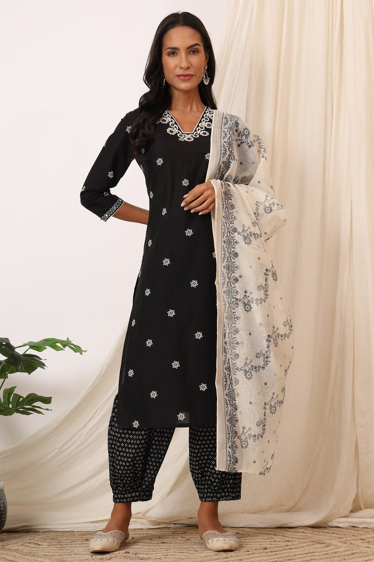 Black Bandhani Printed Pure Cotton Kurta, Pants and Dupatta Set