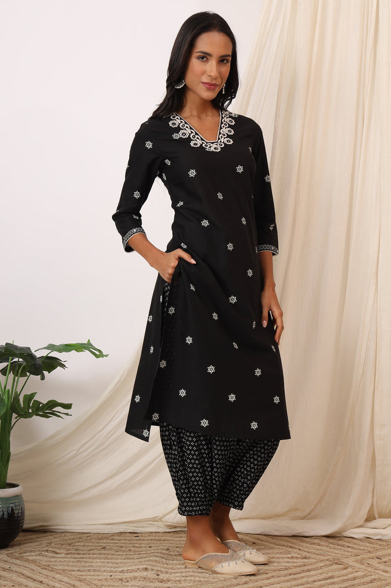 Revamp Your Traditional Wardrobe With This Elegant Yet Stylish White kurta Set. This Contemporary Set Includes Black Chanderi kurta In Floral Motifs And A-Line Silhouette. It Is Coordinated With Black Slim Pants In Mid-Rise And Partially Elasticated Waistband.