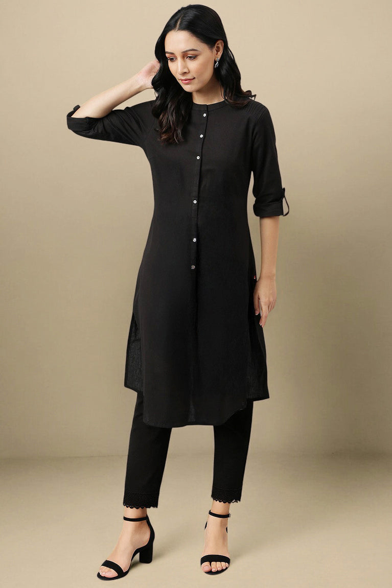 Black Cotton Blend Straight Kurta and Slim Pant Set