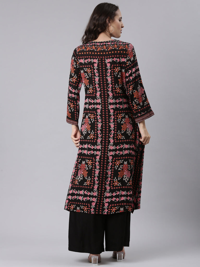 Black printed kurta in round neck and three-quarter sleeves. Paired with matching mid-rise palazzo.