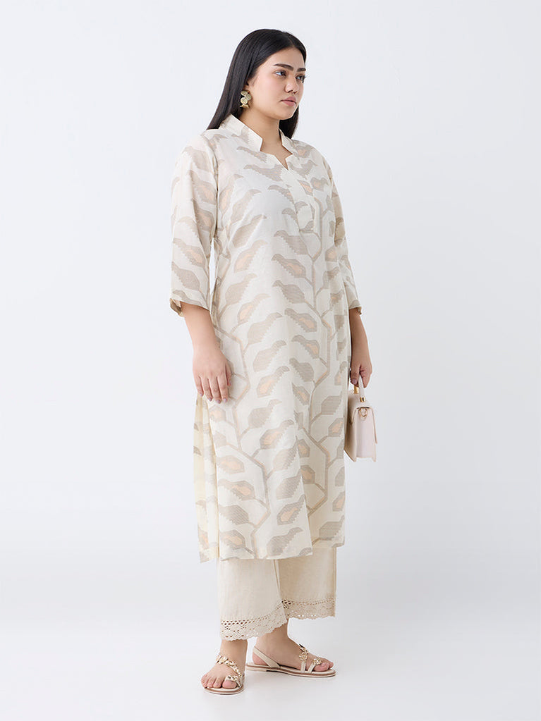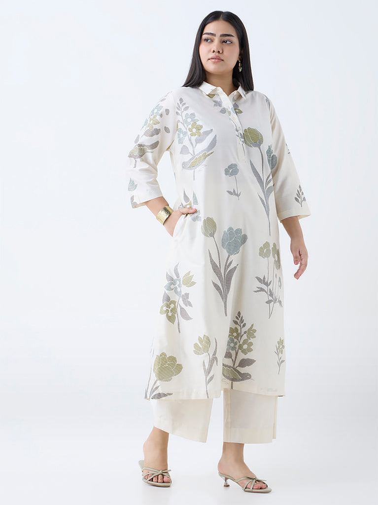 Diza Off-White Botanical Design Cotton-Blend A-Line Kurta