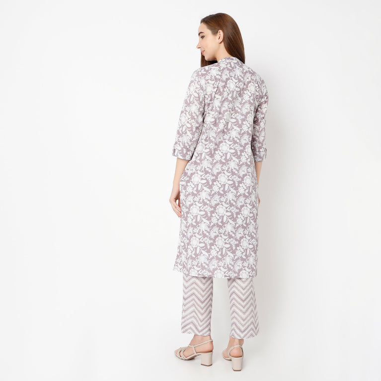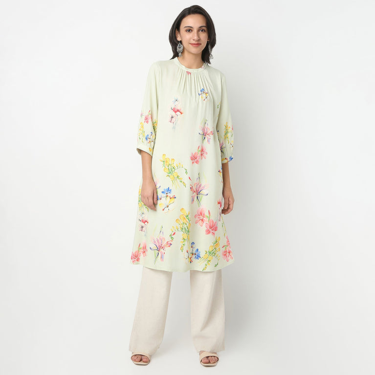 Band Neck Knee Length Three-Fourth Sleeve Straight Fit Printed Kurta