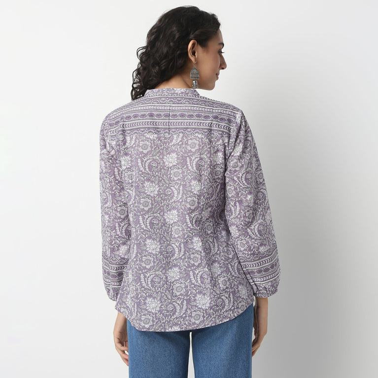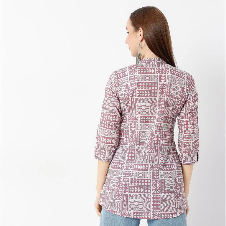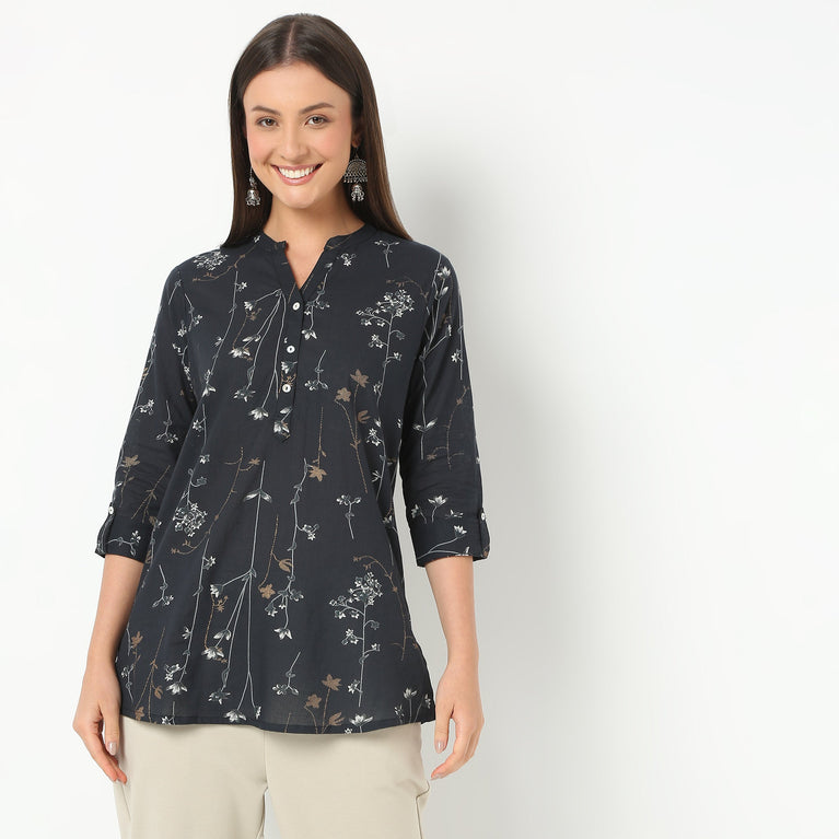 Band Neck Three-Fourth Sleeve Straight Fit Printed Short Kurti
