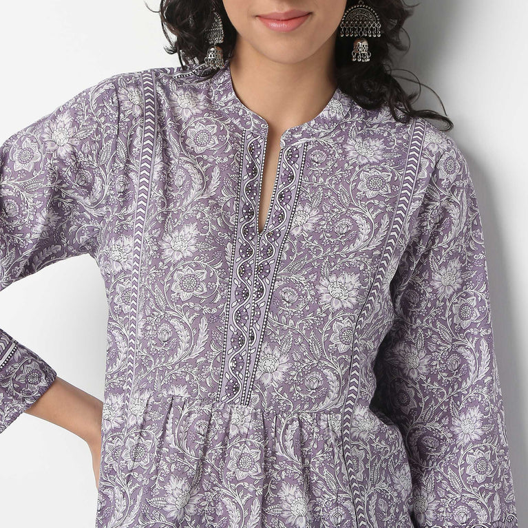 Band Neck Above Knee Three-Fourth Sleeve Flare Fit Printed Short Kurta