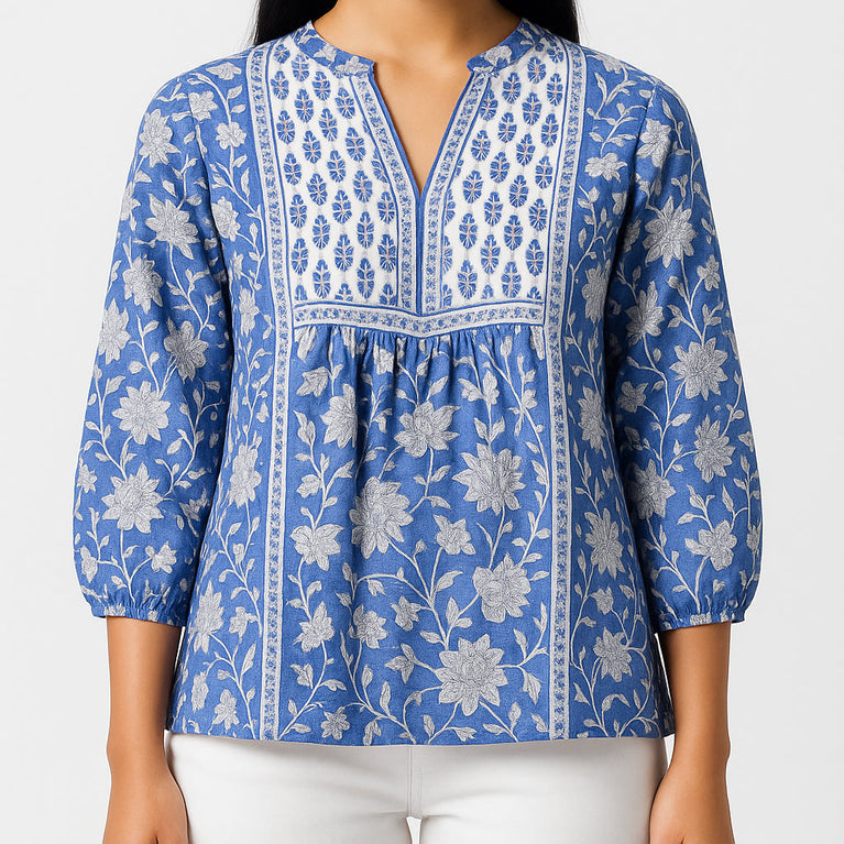 Band Neck Three-Fourth Sleeve Straight Fit Printed Short Kurta