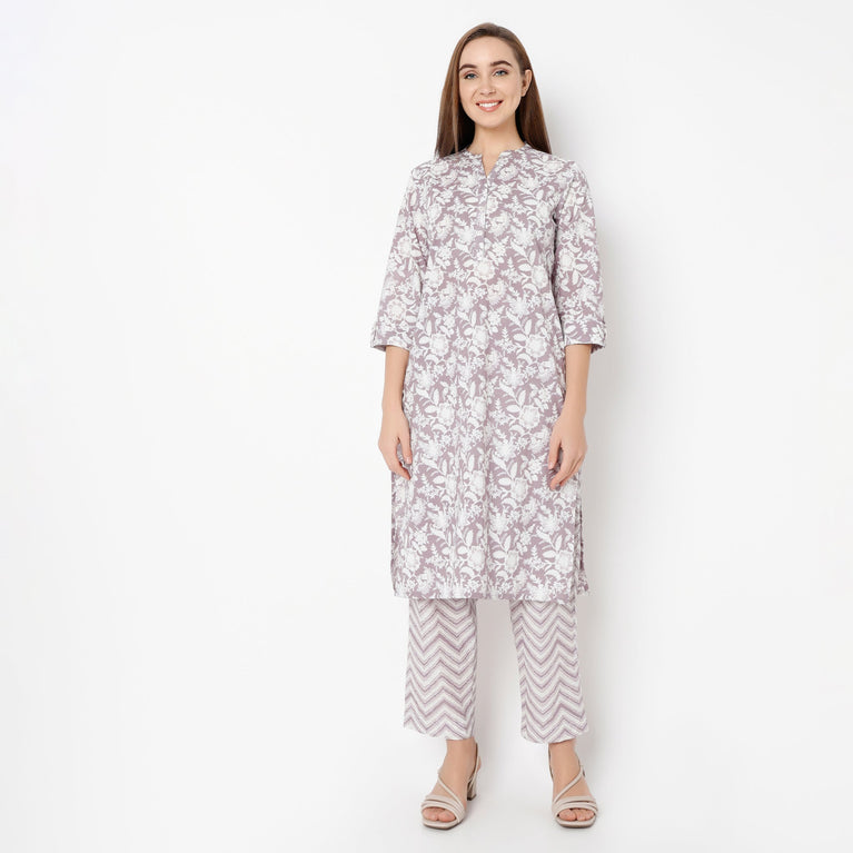 Band Neck Knee Length Three-Fourth Sleeve Printed Straight Fit Kurta