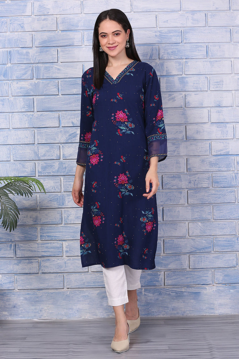 Turkish blue floral print kurta in round neck and three-quarter sleeves, having glitter and sequin detailing.