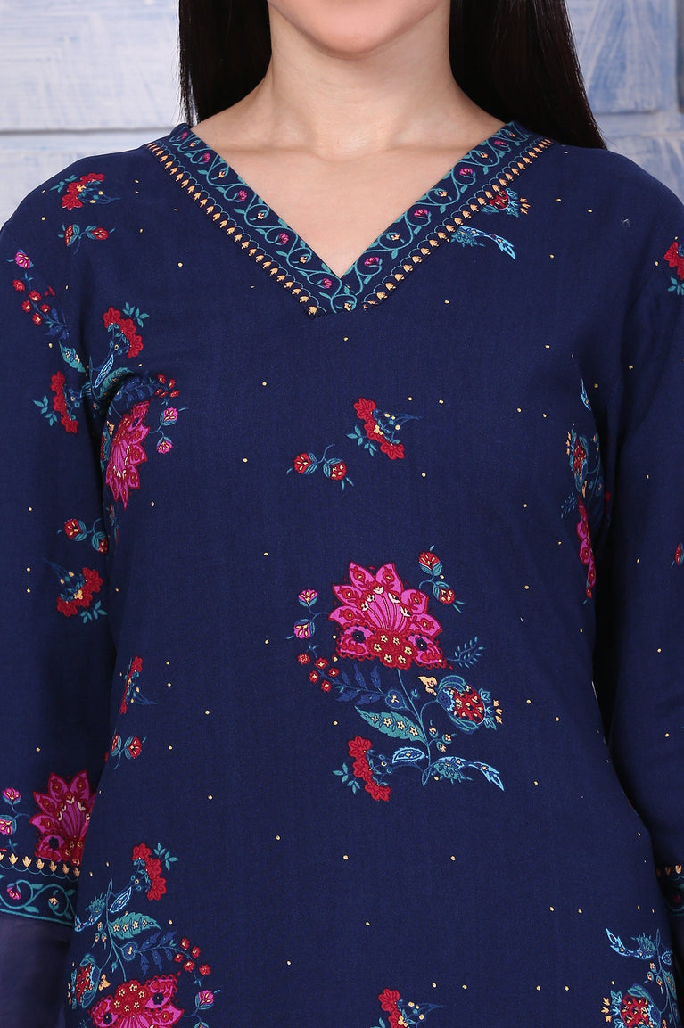 Twilight Blue Floral Printed Short Kurta. It Is Embellished With Multicoloured Thread And Metallic Embroidery On Neckline. Kurta Comes With Tonal Printed Sharara Adorned With Gota Trim. The Set Is Completed With A Tonal Chiffon Drape.