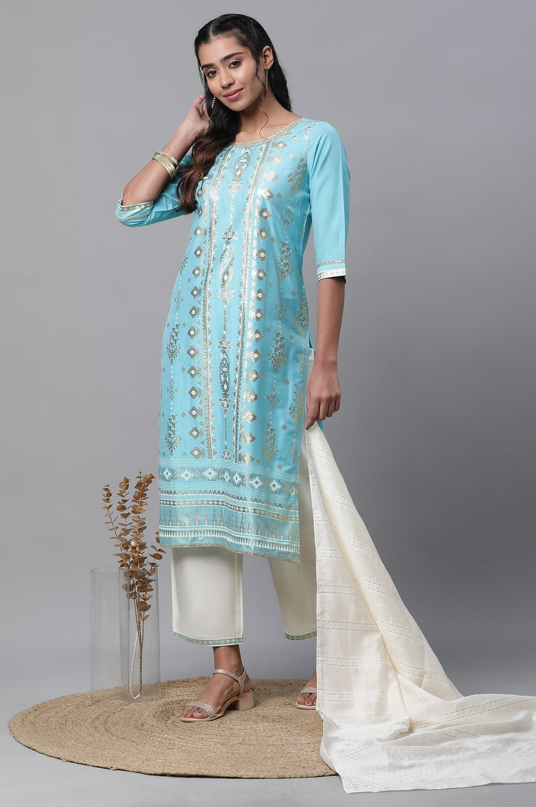 Blue Foil Printed Embellished Kurta, Pants and Dupatta Set