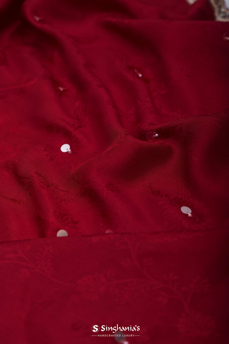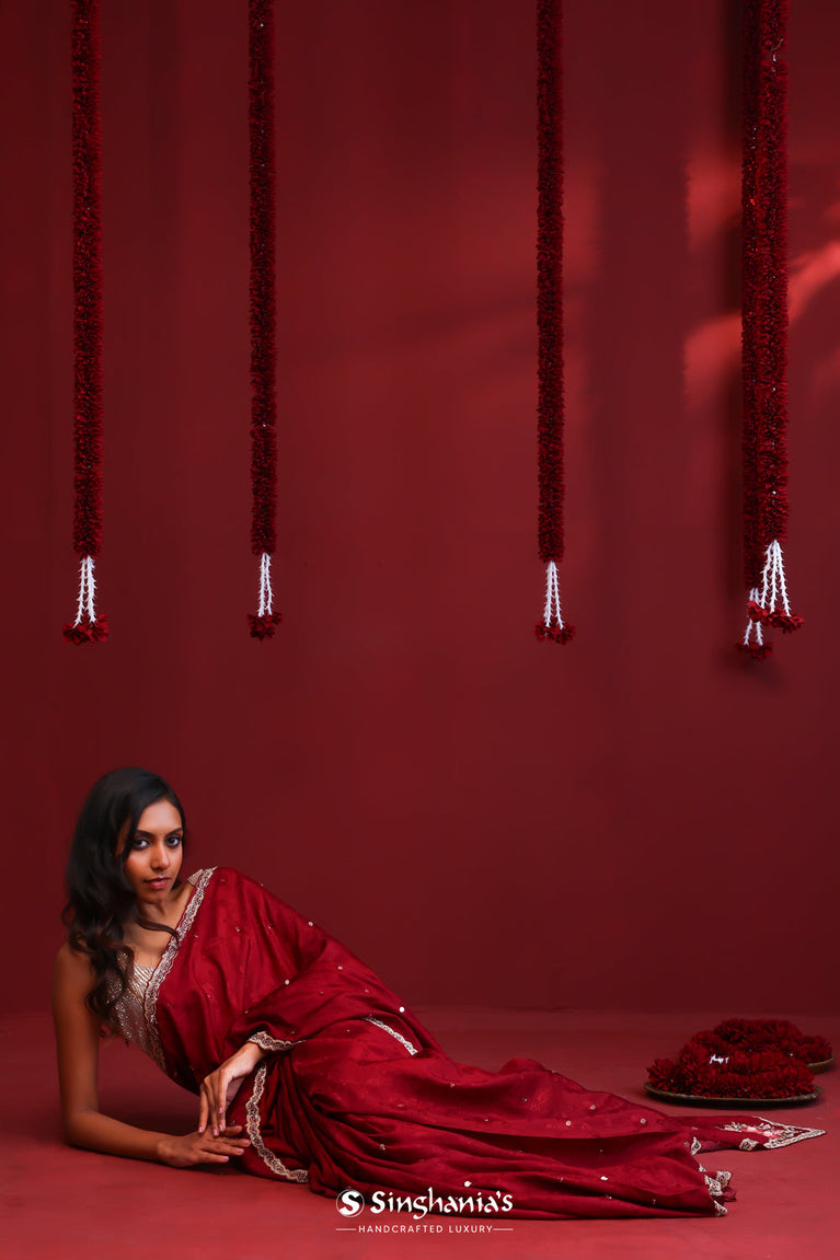 A Deep Maroon Silk Saree with intricate floral butta weaving all over, with small embroidered border and pallu in colourful sequins and glass beadwork. Suitable for festive wear, and wedding parties.