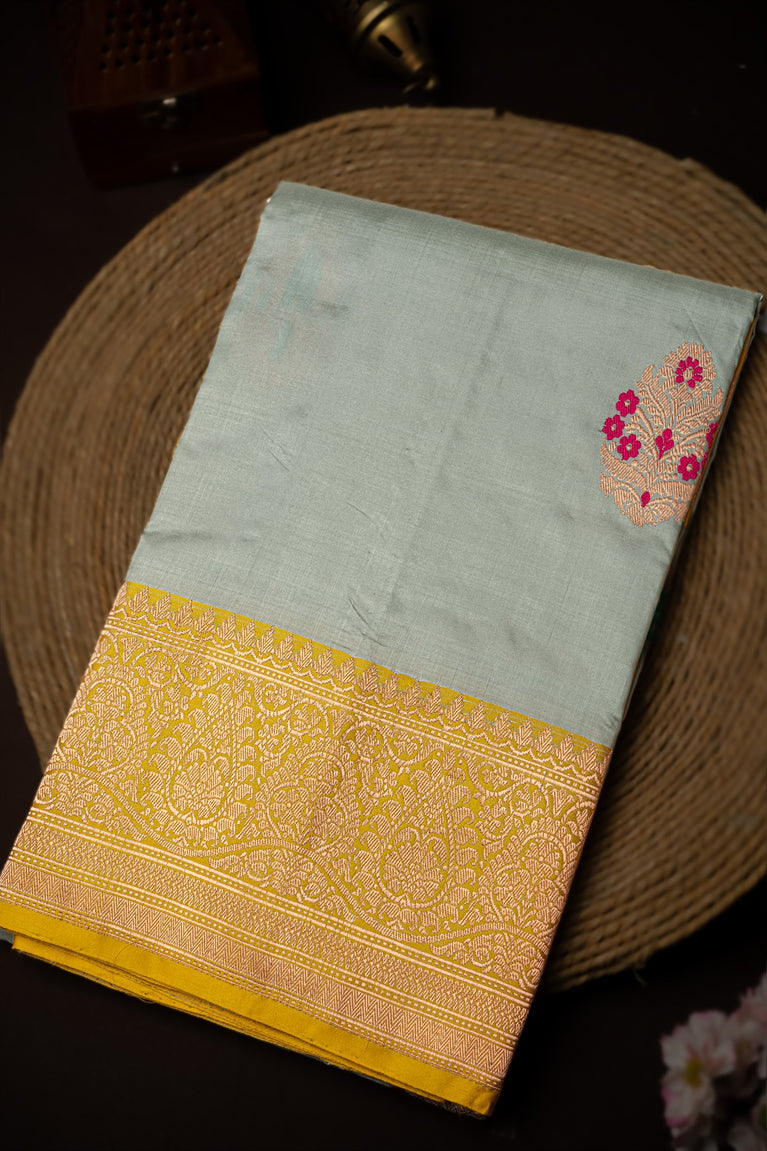 Mandir Light Grey & Yellow Banarasi Motifs Saree
