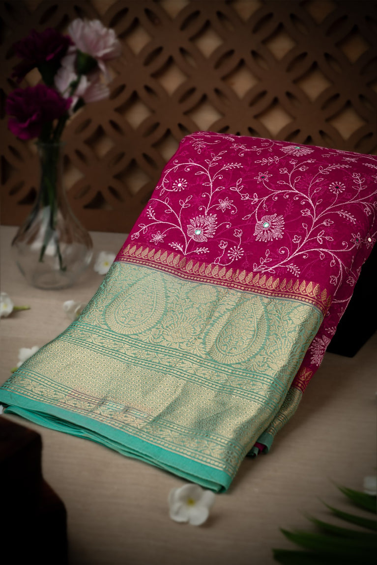 Mandir Maroon & Sea Green Fancy Work Saree