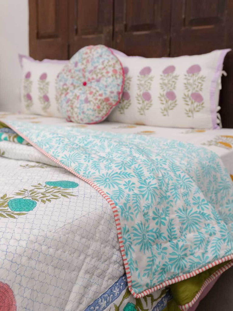 Spring Time Block Printed Cotton Pinwheel Cushion With Filler - 16 Inch