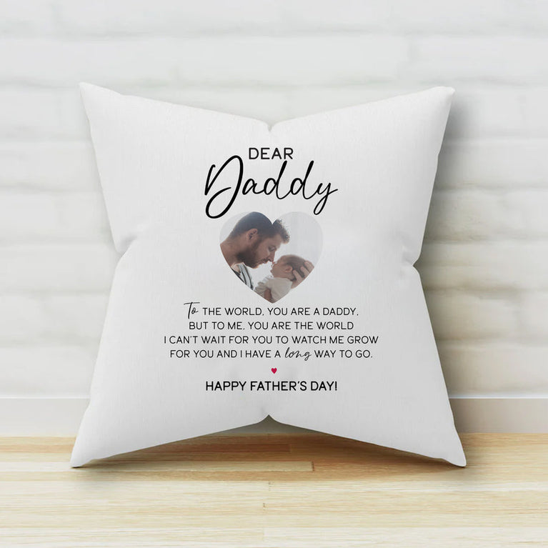 The cushion holds a sweet message from the baby and is customizable with a cute photo of the baby and it's daddy.