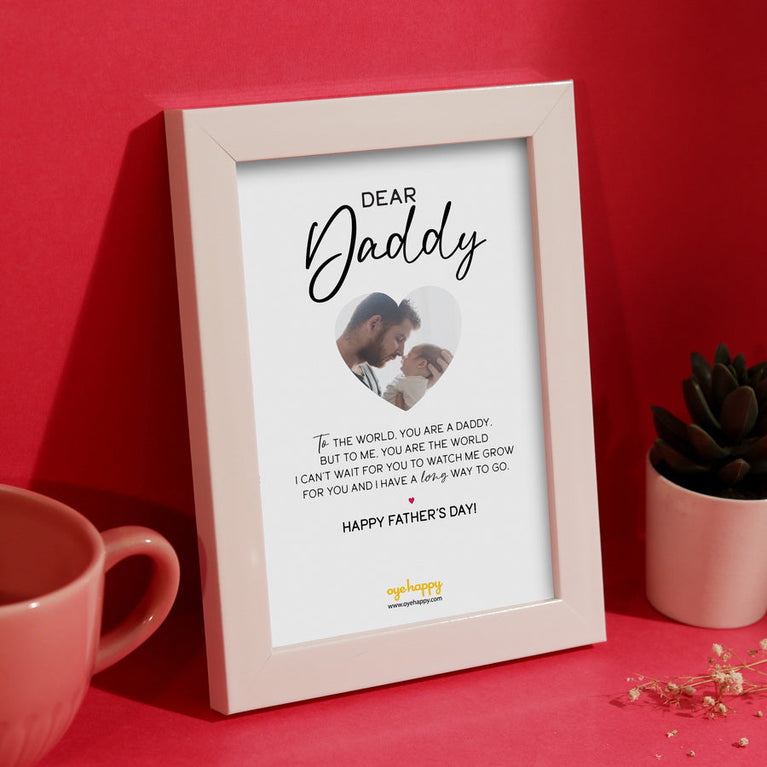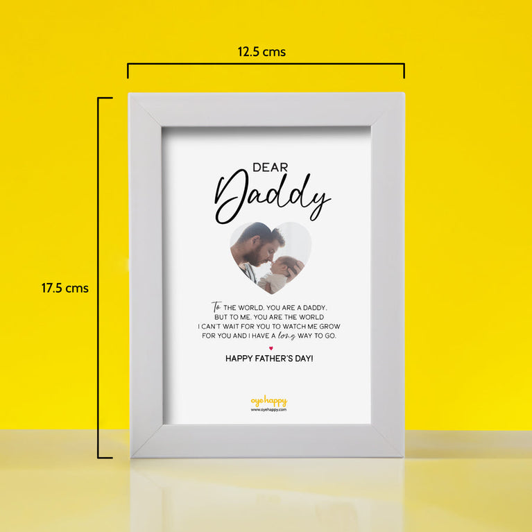 The frame holds a sweet message from the baby and is customisable with a cute photo of the baby and it's daddy. It isn’t just a frame. It's the baby's way of saying “I love you, Dad!Place it on a table, shelf, or hang it on the wall. It will be like a daily dose of love from the little one.Specifications: Size of the Frame - 17.5 x 12.5 cms