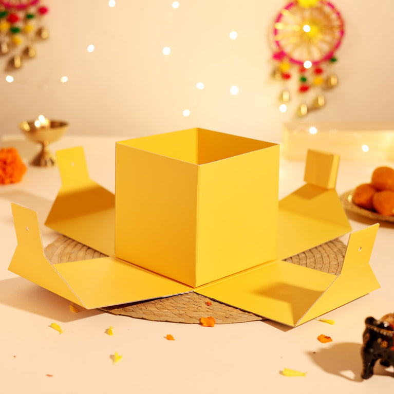 Introducing India’s First Patakha Box — a one-of-a-kind festive surprise that looks like a cracker but opens up as a magical hamper. It’s designed to give you the joy of lighting something special without any noise, or pollution.Celebrate Ayodhya’s spirit of Diwali with a thoughtfully curated hamper that includes:Miniature Ram MandirRam Charan idolLaddoo CandlesA beautiful Greeting CardDesigner Colorful DiyaHow It Works :The Patakha Box is simple and safe to use:Light the wick or pull it gently.Watch the box unfold in a magical way.Experience the joy of festive unboxing with none of the mess or worry.Specifications-Size of the box: 14 cm X 14 cm X 14 cm
