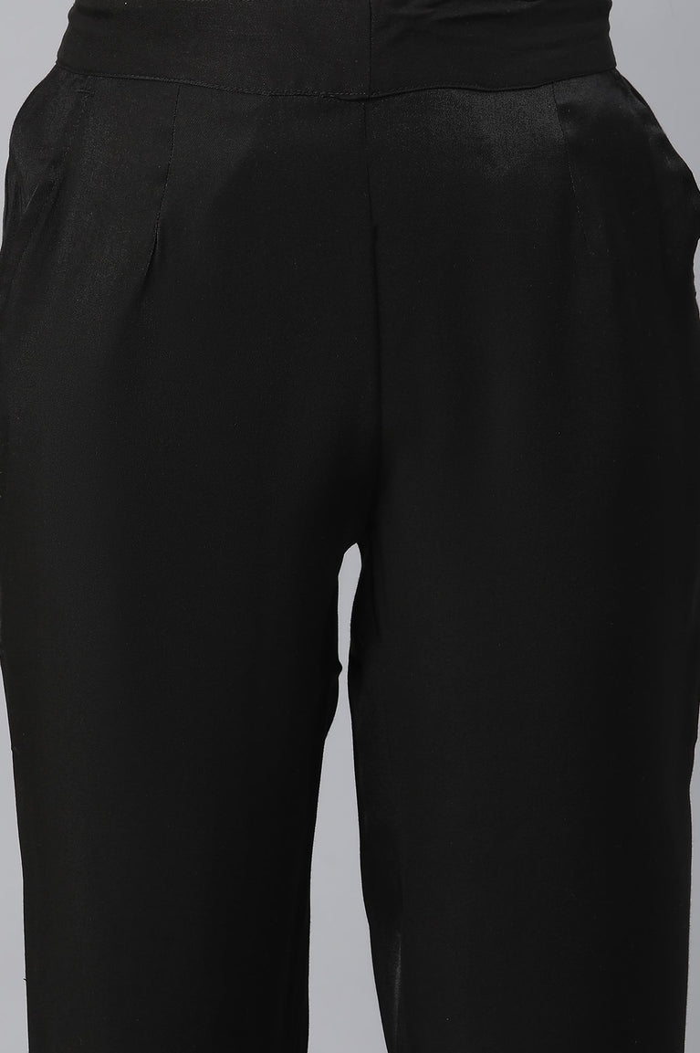 Effortlessly chic and comfortable, these black solid trousers are crafted from 100% cotton for a breathable and soft feel. Featuring a mid-rise design and a partially elasticated waistband, they offer a flattering fit and ease of wear. The straight hem and ankle-length silhouette add a modern touch, while the two front pockets provide practicality. Perfect for casual outings, pair these versatile trousers with a kurta and flats for a relaxed yet stylish look.