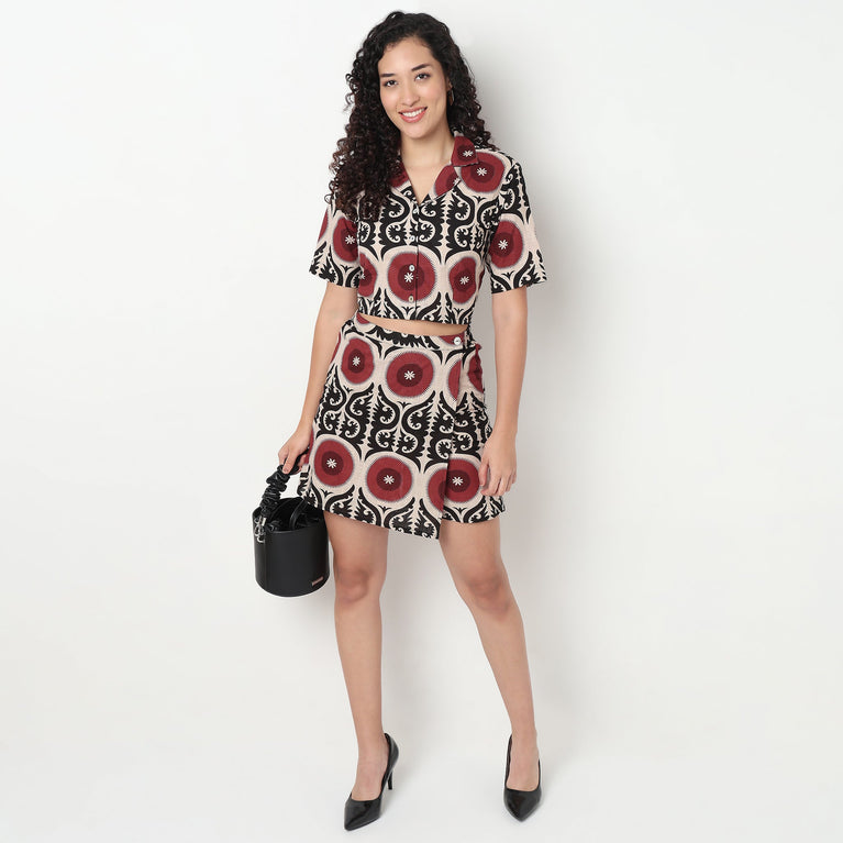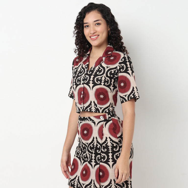 Experience the perfect blend of style and comfort with our Lapel Collar Crop Shirt. Crafted from 100% cotton slub, this shirt offers a breathable and soft touch against your skin, making it ideal for all-day wear. The printed pattern adds a touch of elegance, while the cropped length and elbow sleeves provide a modern twist to a classic design.