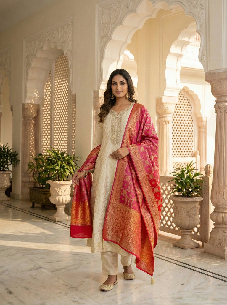 Elevate your ethnic wardrobe with this exquisite Beige Banarasi Zari Embroidered Three Piece Set. Crafted with traditional Banarasi weaving techniques, this ensemble features intricate zari embroidery that catches light beautifully. The versatile beige tone complements all skin tones and pairs effortlessly with your existing collection. Perfect for weddings, festivals, and special occasions, this three-piece set offers complete styling convenience. Experience the timeless elegance of authentic Indian craftsmanship combined with contemporary design sensibilities.