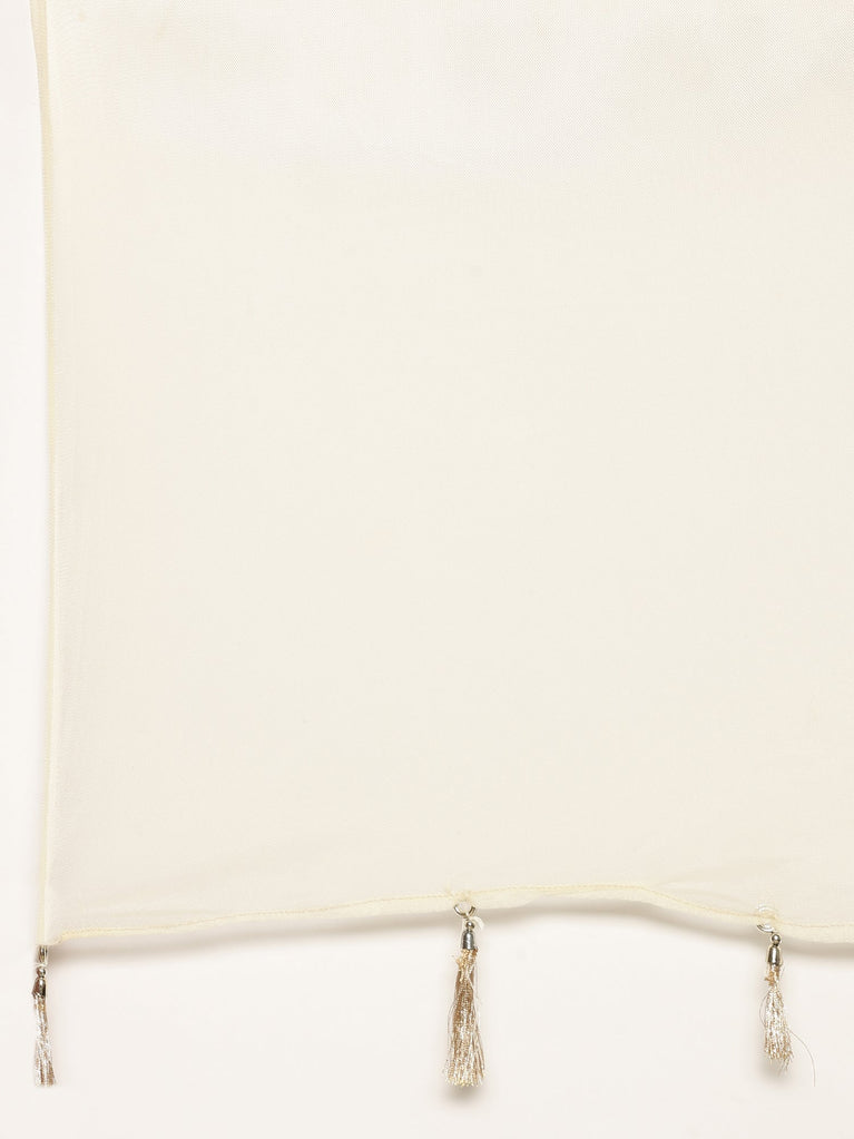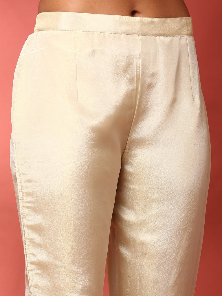 This beige Chanderi three-piece set features delicate handwork that adds an elegant, timeless charm to your wardrobe. Crafted from breathable fabric, it ensures comfort throughout the day while its intricate detailing elevates your look for both casual and festive occasions. Perfect for those seeking a blend of tradition and style, this set is a versatile addition that supports your desire for effortless grace.