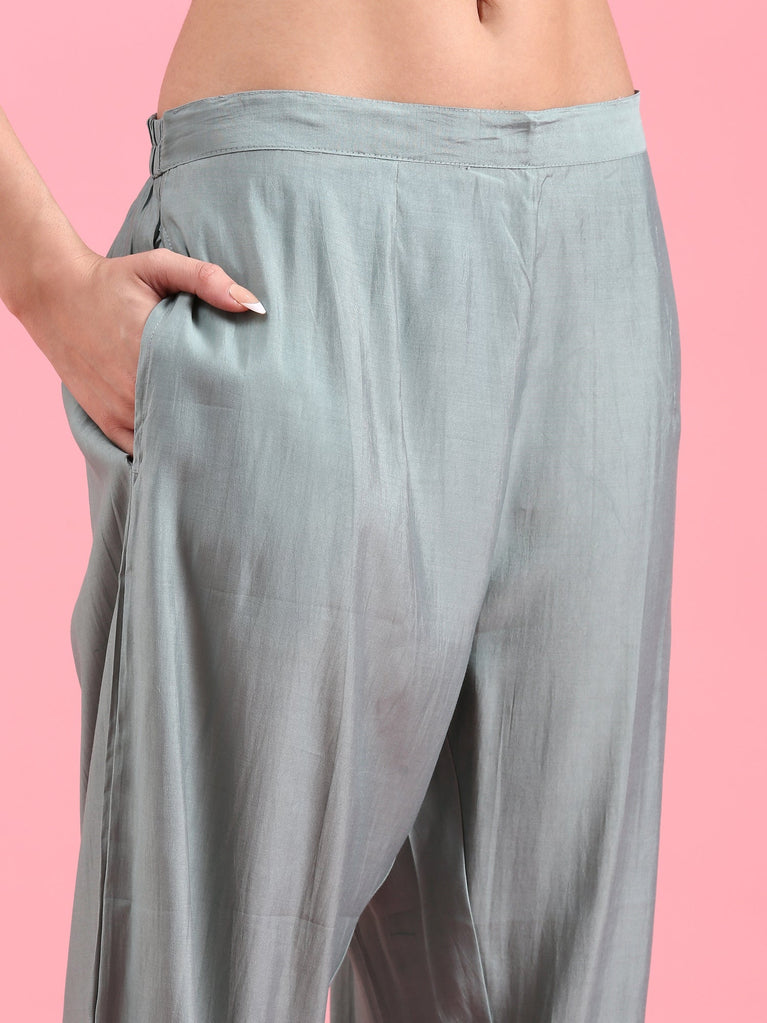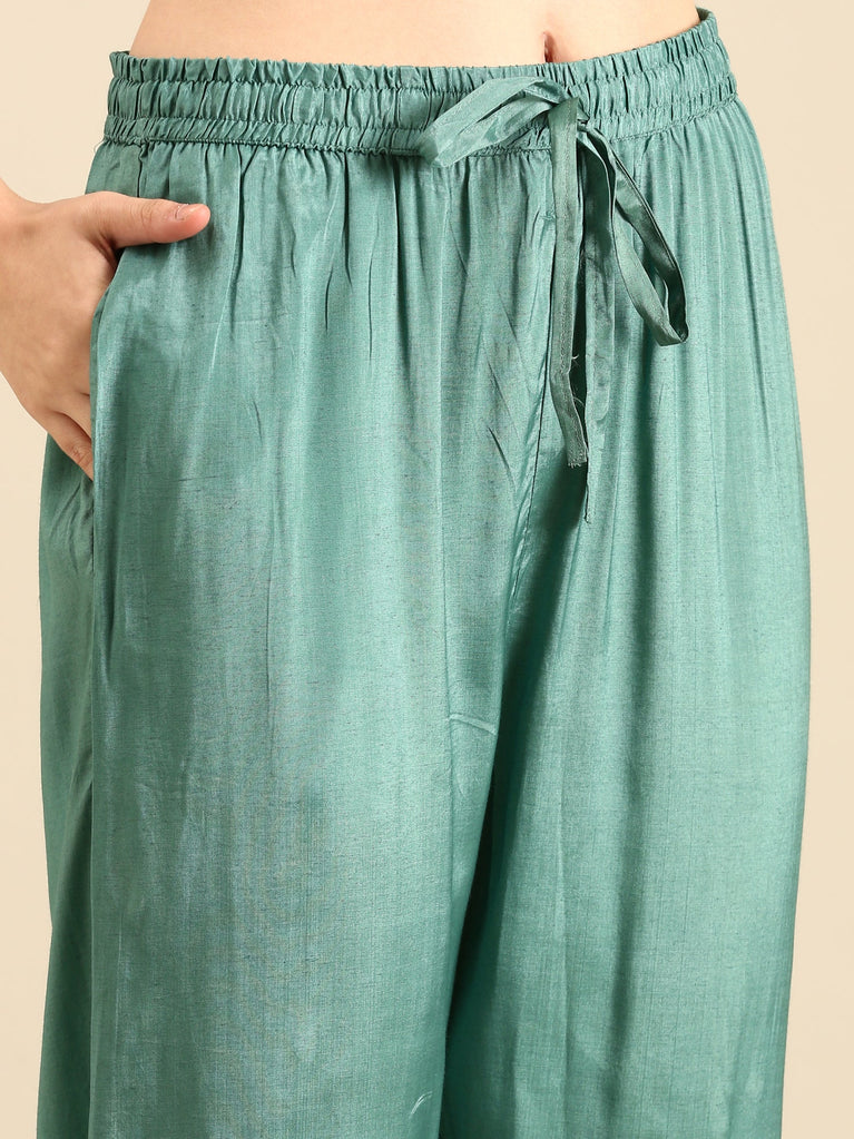 Elevate your wardrobe with this aqua green three-piece palazzo set, featuring intricate hand embroidery that showcases exquisite craftsmanship. The flowing palazzo pants offer comfort and elegance, perfectly complemented by a matching embroidered top and coordinating dupatta. Ideal for festive occasions or sophisticated gatherings, this set combines traditional artistry with contemporary style for a refined, graceful look.