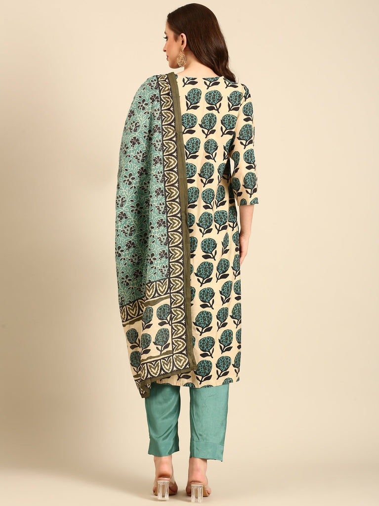 Elevate your ethnic wardrobe with this sophisticated three-piece ensemble crafted from premium modal silk. The beige base provides a versatile canvas, while intricate floral digital prints add contemporary elegance to traditional silhouettes. Modal silk's natural breathability and luxurious drape ensure comfort throughout the day, making this set ideal for festive occasions, celebrations, or refined everyday wear.