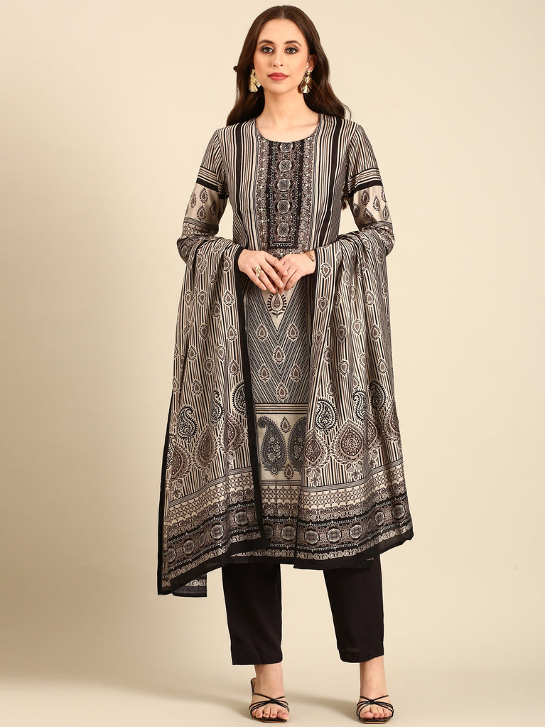 Elevate your wardrobe with this beige and black three-piece suit set featuring an exquisite all-over black and white crepe fabric print. Hand-embellished with shimmering sequins and delicate mirror work, it adds a touch of timeless elegance and craftsmanship. Perfect for special occasions, this suit offers a unique blend of traditional artistry and contemporary style to make you stand out effortlessly.