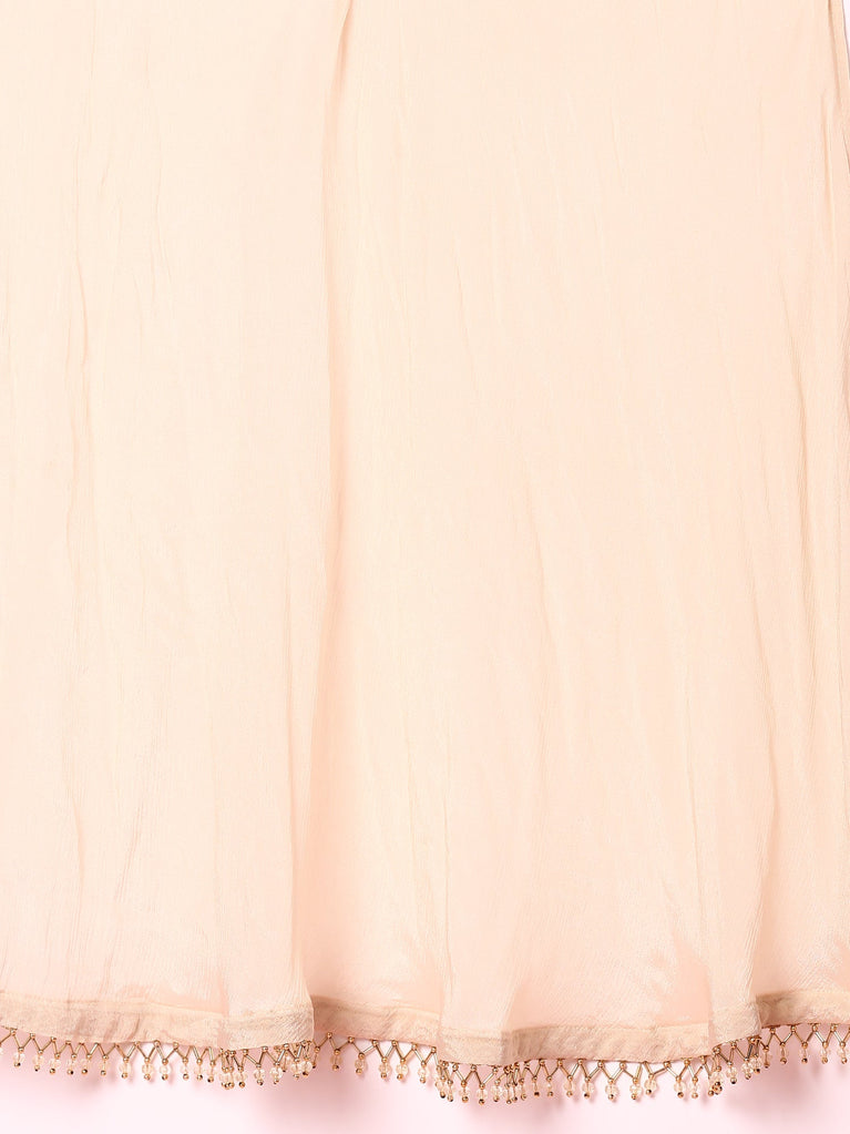 Elevate your traditional wardrobe with this beige three-piece tissue silk anarkali set, exquisitely hand-embroidered to showcase fine craftsmanship. The lightweight tissue silk fabric ensures comfort and flow, while the elegant embroidery adds a touch of sophistication. Perfect for festive occasions or special events, this ensemble blends timeless style with graceful charm, making you stand out effortlessly.