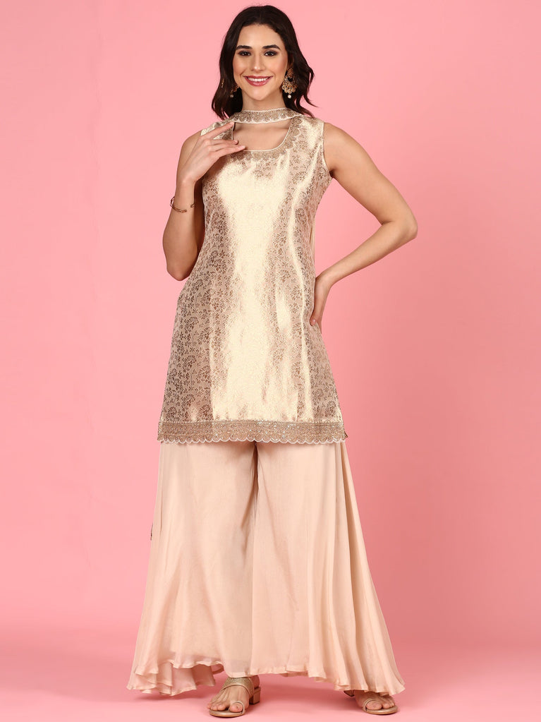 Embrace elegance with this Beige Banaras three-piece set, featuring a short kurta and matching palazzo pants. Crafted with refined Banarasi fabric, it offers a comfortable fit while showcasing intricate traditional patterns. Perfect for festive occasions or casual gatherings, this set blends style and ease, ensuring you feel confident and graceful throughout the day.