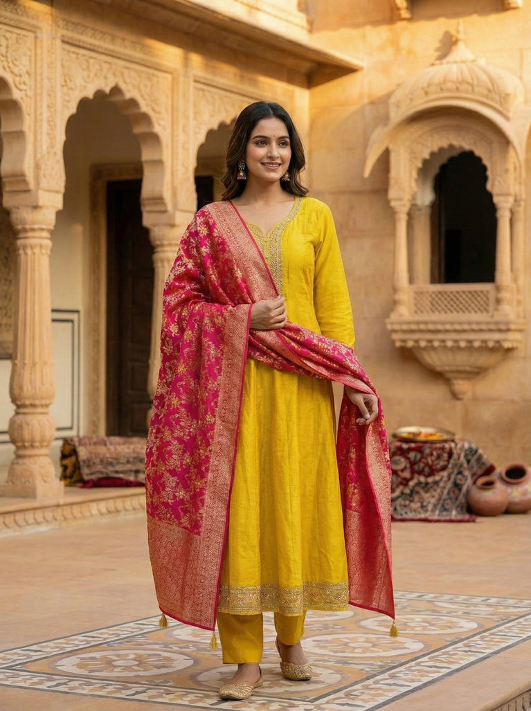 Elevate your ethnic wardrobe with this sophisticated three-piece ensemble crafted from premium dola silk. The mustard base provides a warm, versatile canvas that complements all skin tones, while the intricate floral digital print adds contemporary elegance to traditional styling. Dola silk's natural lustre and fluid drape create a refined silhouette, making this set ideal for festive occasions, celebrations, and formal gatherings.