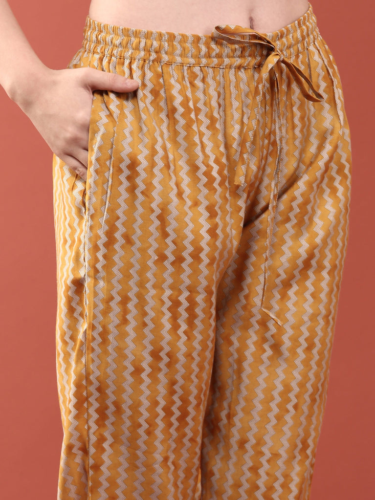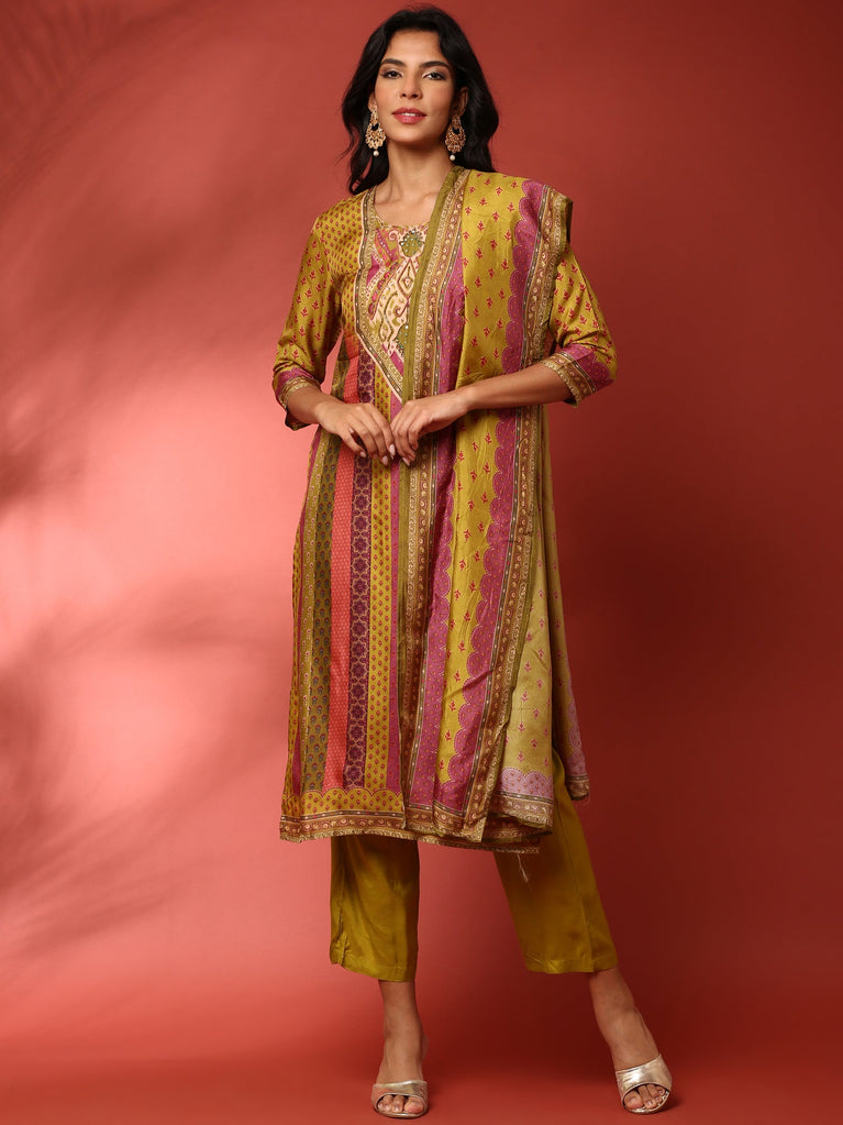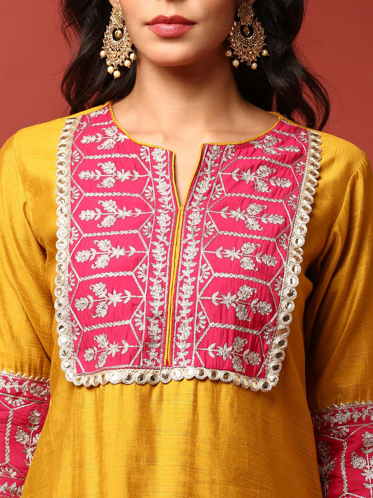 Mustard Chanderi Embroidery Aline Three Piece Suit Set